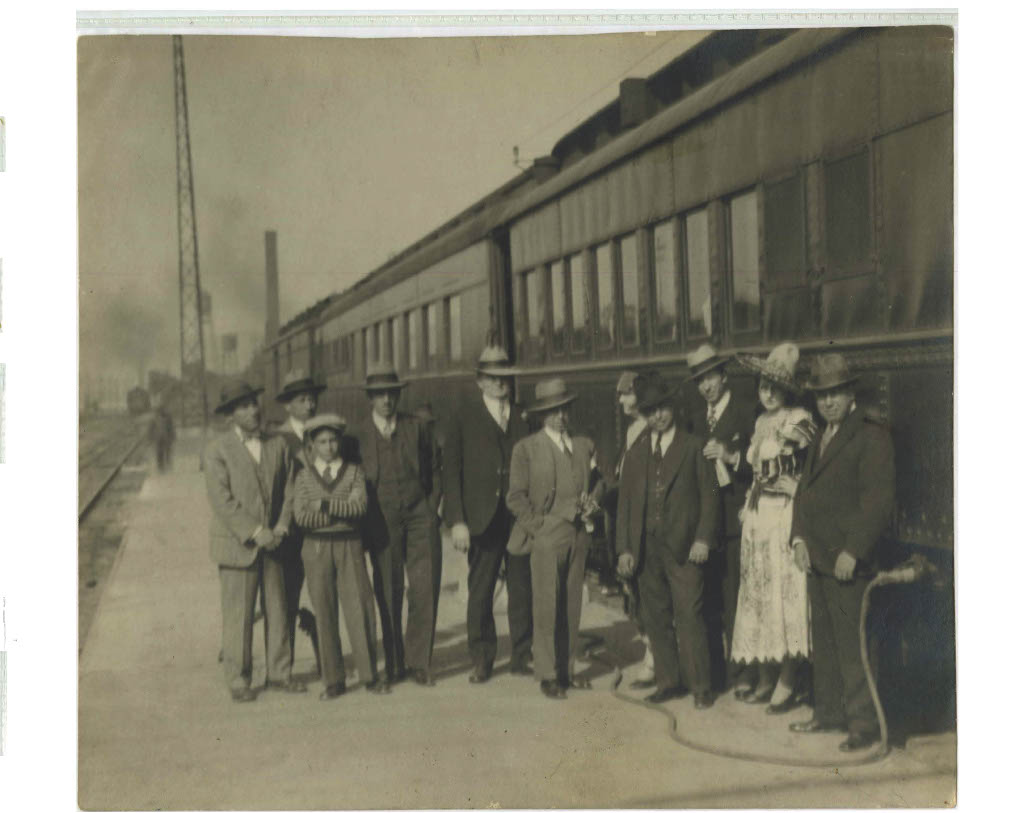Presumably a gathering for Majestic Radio company, outside of a train.